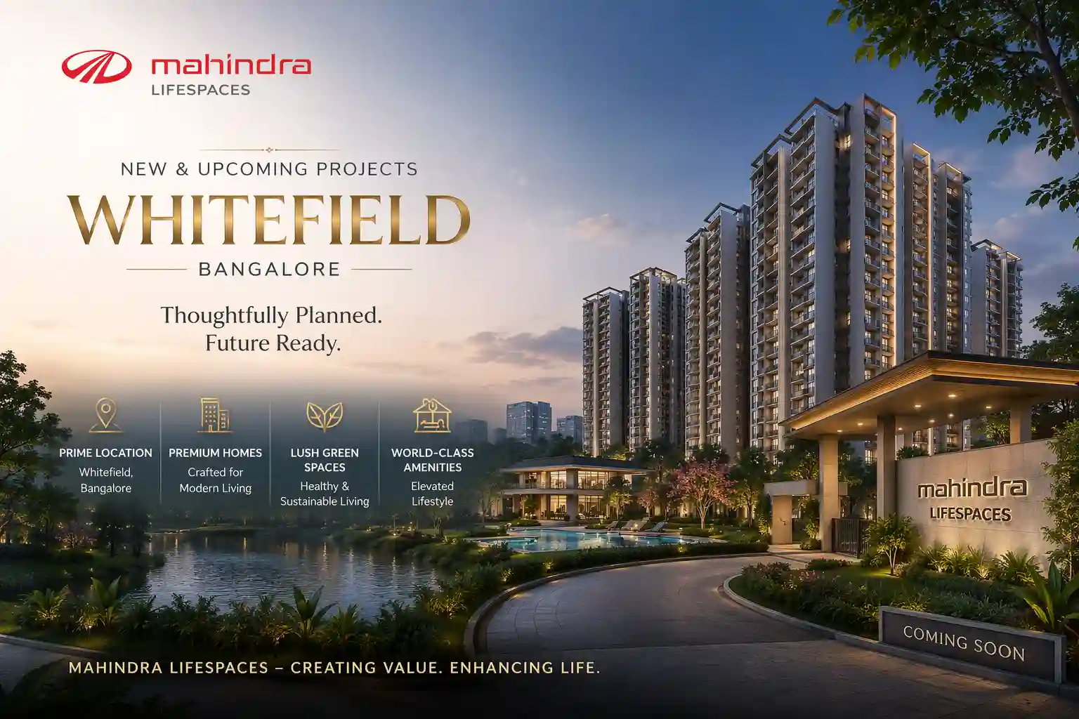 New and upcoming projects by Mahindra Lifespaces in Whitefield, Bangalore are emerging as sustainable, premium residential communities in East Bangalore’s fast-growing IT corridor, driven by metro connectivity and strong infrastructure growth. Key developments like Mahindra Blossom, spread across ~9 to 10 acres, feature 700+ apartments in G+29 towers with 2, 3, 3.5, and 4 BHK configurations, designed with 75% to 85% open spaces and low-density planning. The project also offers 97,000 sq. ft. of amenities and a GDV potential of around ₹1,700 to ₹1,900 crore, highlighting its large-scale investment value. Strategically located near Hope Farm metro station, ITPL, and major tech parks, these developments ensure strong rental demand and seamless connectivity. With Mahindra Lifespaces holding a development footprint of 50+ million sq. ft. across India, its Whitefield projects focus on green-certified homes, modern design, and long-term appreciation potential, making them ideal for both end-users and investors.